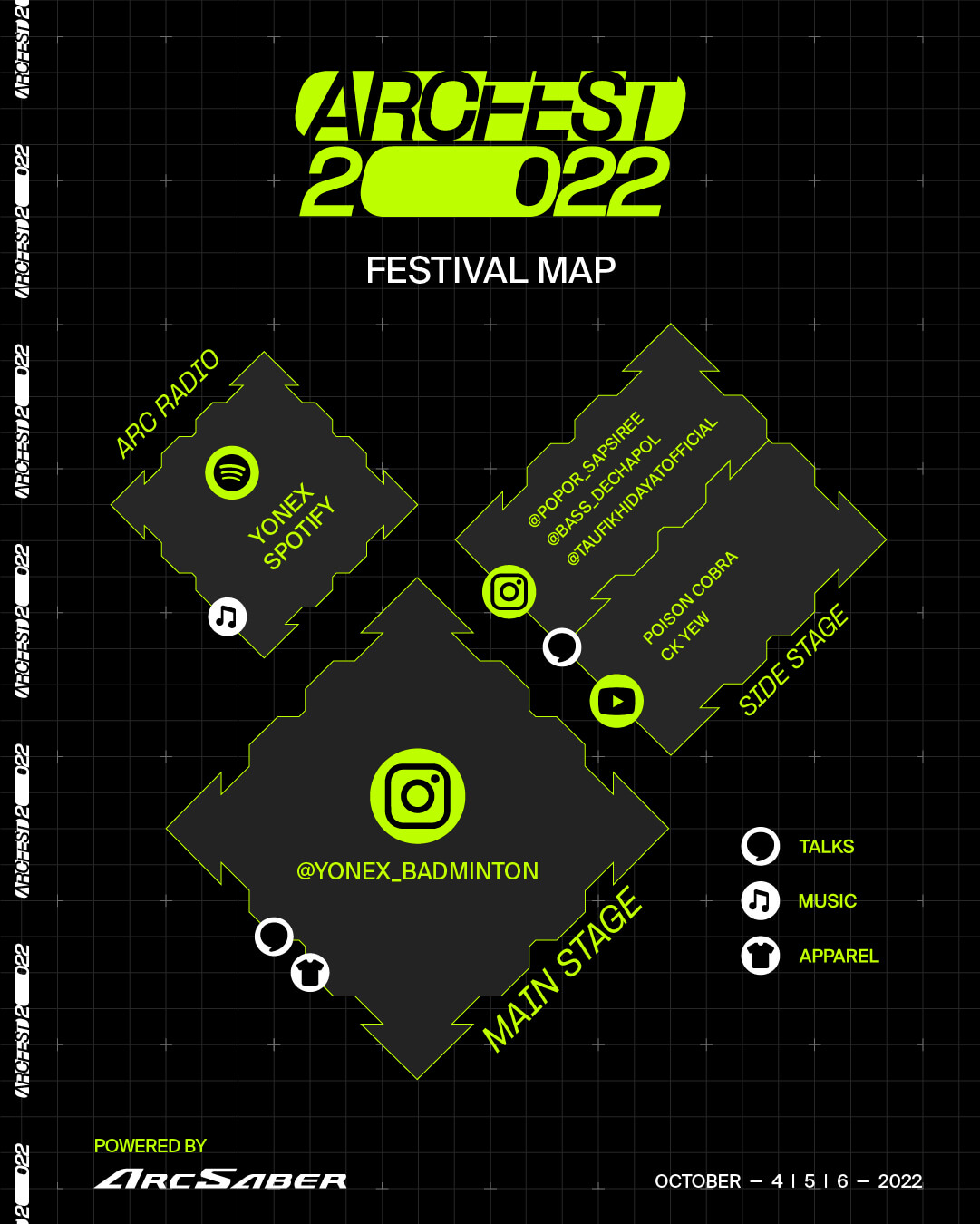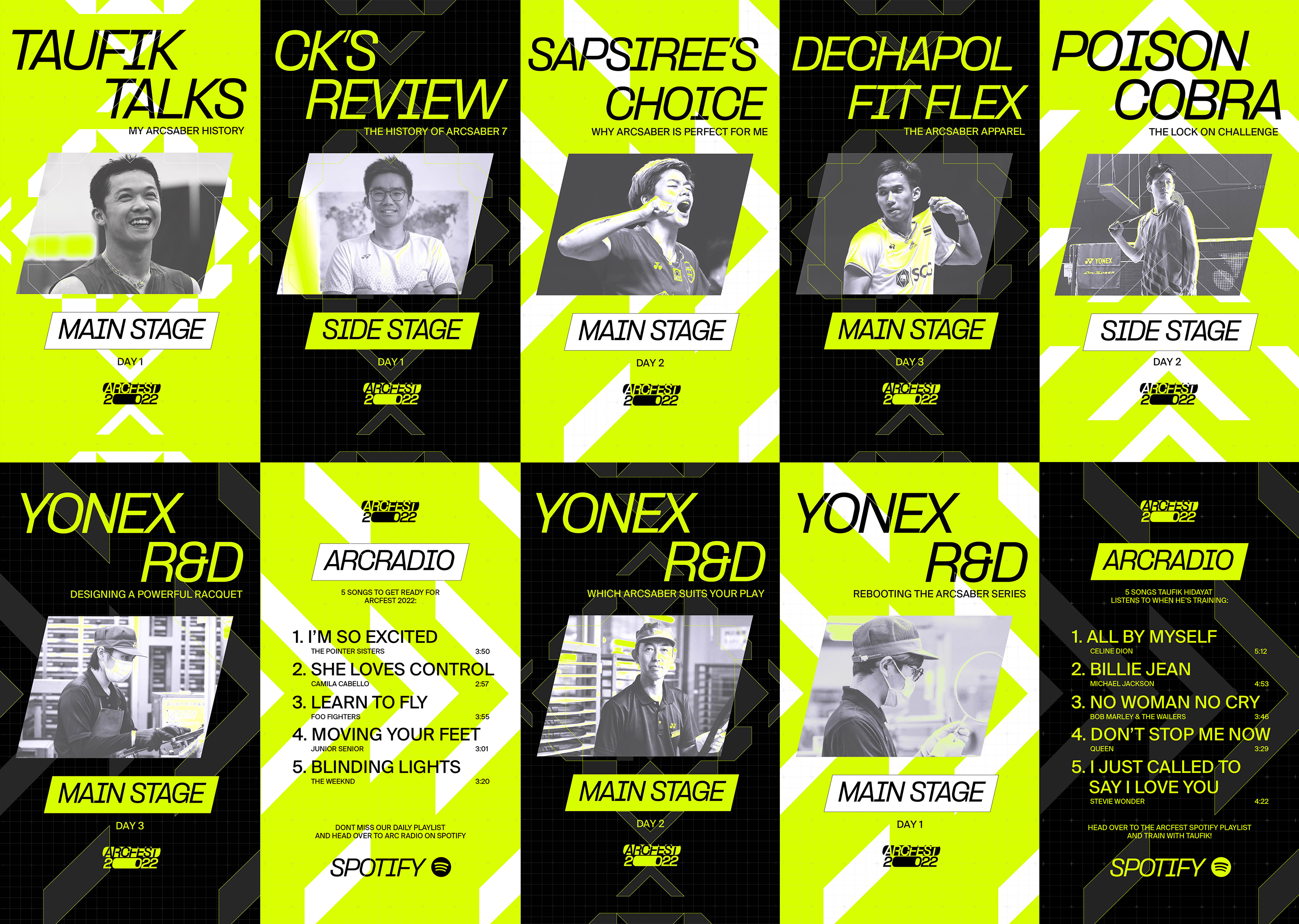The digital campaign fully embodies all aspects of visiting a physical festival, with wristbands, posters and maps, whilst harnessing vibrant iconography, language and branding established for the Arcsaber series in earlier campaigns. It takes place over three digital ‘stages’ and features high profile athletes delivering unique content about the new Arcsaber 7 racquet.