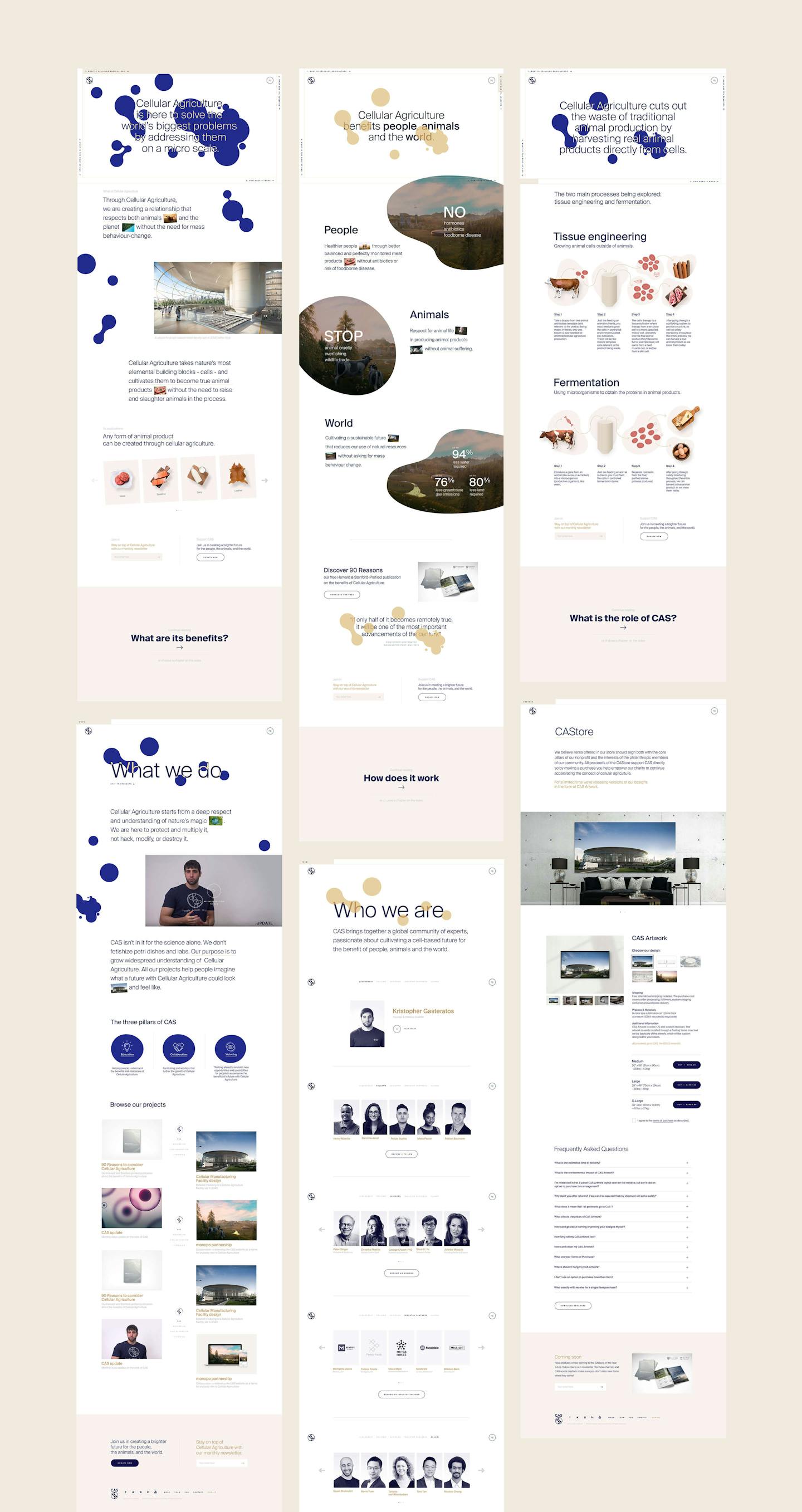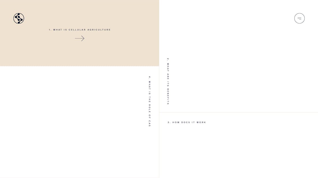 The homepage was designed to work as a one-page introduction to the subject of cellular agriculture and CAS. The perfect introduction for anybody new and interested in the subject. We didn’t want to overwhelm a new audience with an information-dump however. Instead, we created a navigation concept that tells the story of CAS in four simple chapters, capturing people’s attention and holding onto it as they go from chapter to chapter. People can follow the linear narrative or can skip around to the chapter they are most interested in by using the navigation spread across the four edges of the screen. The homepage then leads on to secondary pages that go into more depth on the work CAS has done as an organisation and the team that is working behind the scenes.