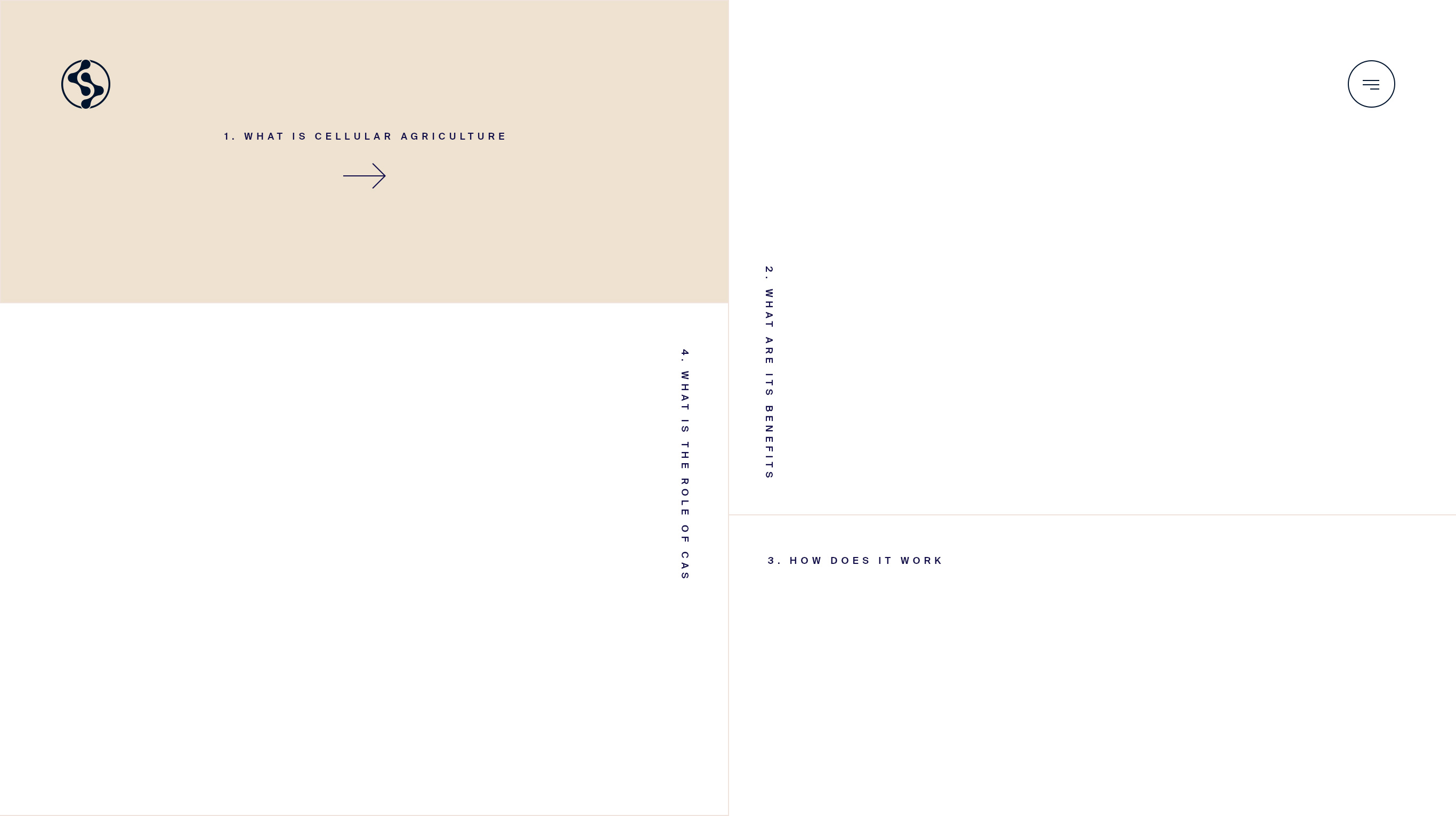 The homepage was designed to work as a one-page introduction to the subject of cellular agriculture and CAS. The perfect introduction for anybody new and interested in the subject. We didn’t want to overwhelm a new audience with an information-dump however. Instead, we created a navigation concept that tells the story of CAS in four simple chapters, capturing people’s attention and holding onto it as they go from chapter to chapter. People can follow the linear narrative or can skip around to the chapter they are most interested in by using the navigation spread across the four edges of the screen. The homepage then leads on to secondary pages that go into more depth on the work CAS has done as an organisation and the team that is working behind the scenes.