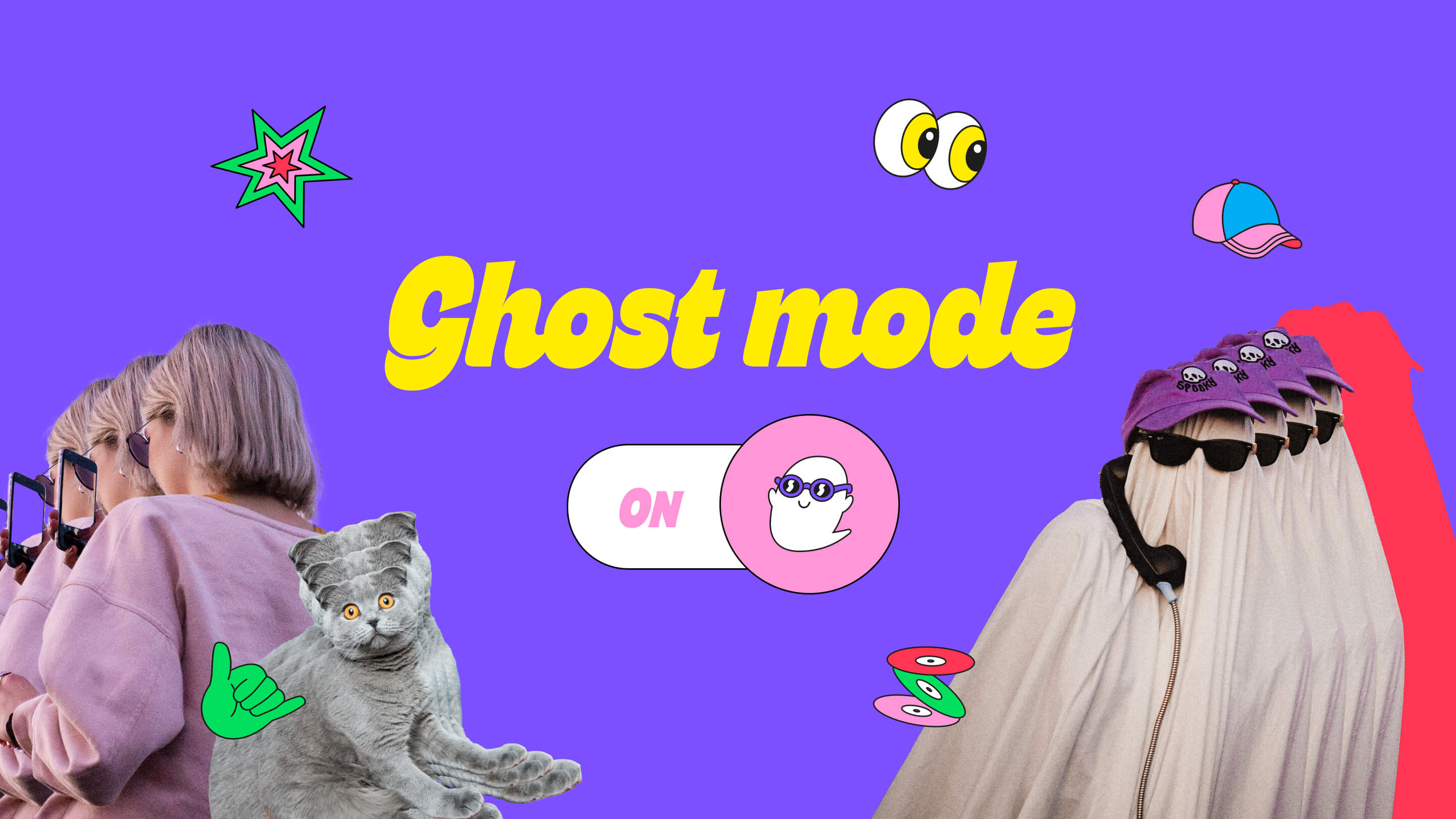 Inspired by emojis and internet culture, Ghost has its own collection of funky digital stickers to be used in our communication and within the app.