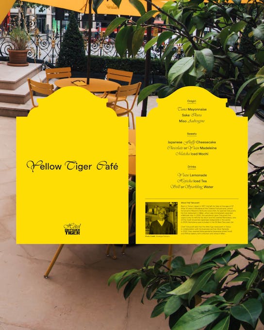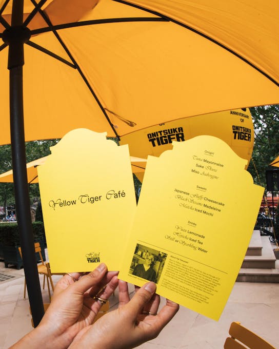 Originally known as the Hôtel de la Païva established in 1866, the grandiose building provided the perfect juxtaposition between heritage and modernity for the Japanese brand. The energy created by mixing old and new is a red thread throughout all design executions. Café menus lead with the iconic Onitsuka Tiger yellow but feature an ornate die-cut that references the building’s own roof decorations, and the typographic system combines selective uses of serifs with the starkly modern sans serif of the Onitsuka Tiger brand.