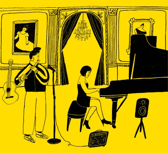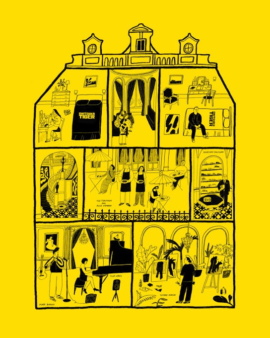 Acting as a real cornerstone to the whole activity, was an illustrated key visual by Edie Medley. The illustration shows a cross-section of the 18th-century building, inhabited by an eclectic set of contemporary artist residents, as well as Onitsuka Tiger founder Kihachiro Onitsuka himself. Edie’s illustration style added a whole new layer of meaning, set against the backdrop of 19th century grandeur and the starkness of Onitsuka Tiger’s vibrant yellow identity. Because the key visual depicted several rooms and scenes of the Hôtel, it was a very versatile illustration that was used across communications, social media and Hôtel design.