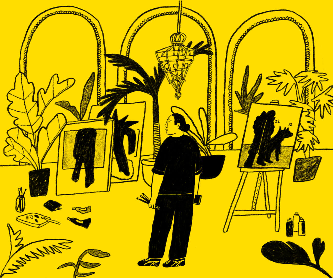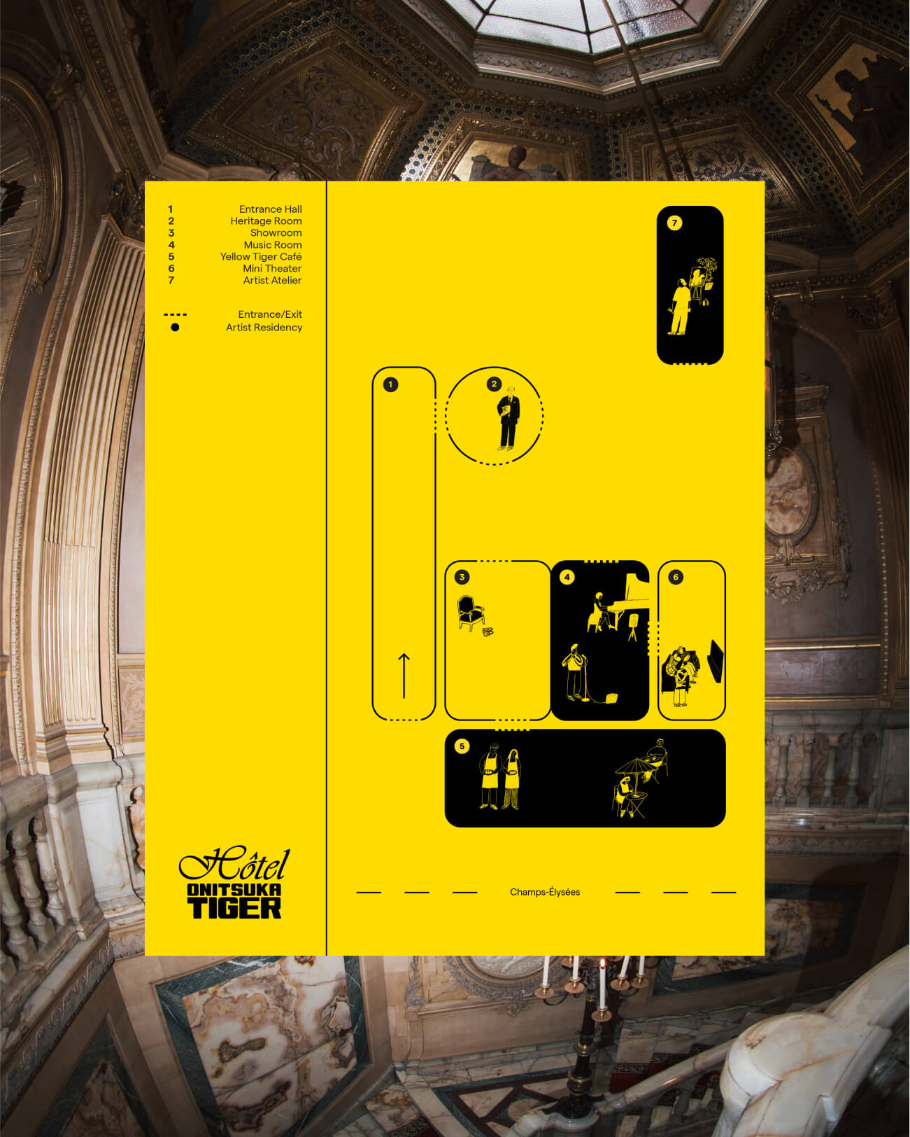 Acting as a real cornerstone to the whole activity, was an illustrated key visual by Edie Medley. The illustration shows a cross-section of the 18th-century building, inhabited by an eclectic set of contemporary artist residents, as well as Onitsuka Tiger founder Kihachiro Onitsuka himself. Edie’s illustration style added a whole new layer of meaning, set against the backdrop of 19th century grandeur and the starkness of Onitsuka Tiger’s vibrant yellow identity. Because the key visual depicted several rooms and scenes of the Hôtel, it was a very versatile illustration that was used across communications, social media and Hôtel design.
