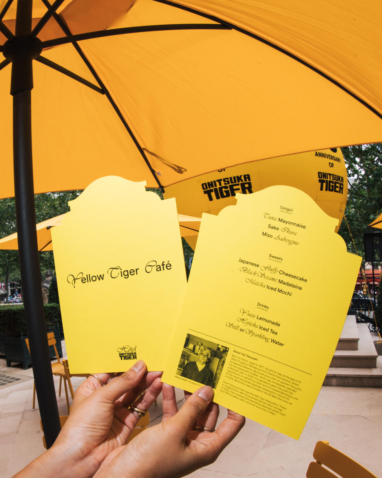 Originally known as the Hôtel de la Païva established in 1866, the grandiose building provided the perfect juxtaposition between heritage and modernity for the Japanese brand. The energy created by mixing old and new is a red thread throughout all design executions. Café menus lead with the iconic Onitsuka Tiger yellow but feature an ornate die-cut that references the building’s own roof decorations, and the typographic system combines selective uses of serifs with the starkly modern sans serif of the Onitsuka Tiger brand.