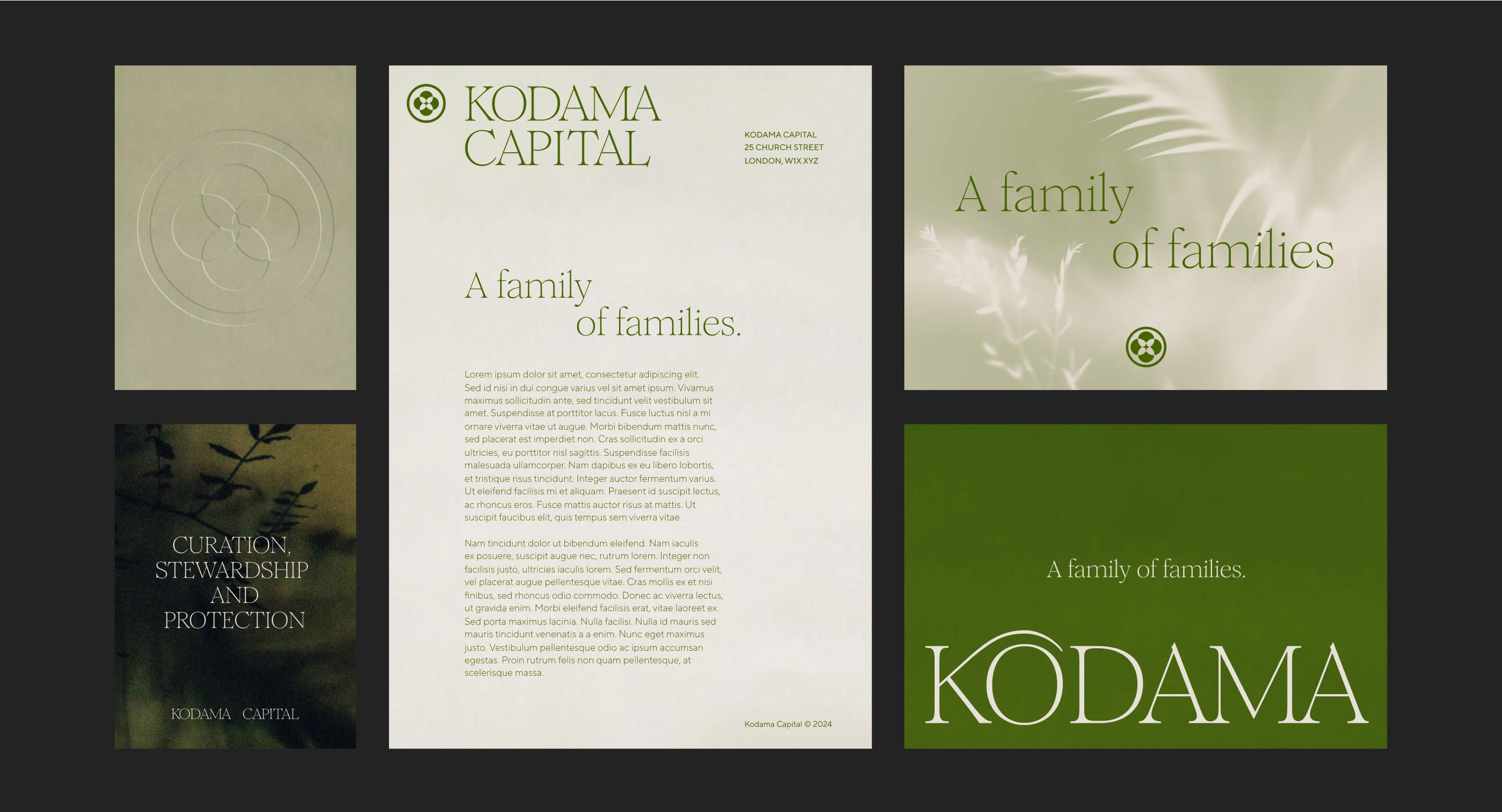 Our inspiration for the logo came from traditional Japanese Kamon emblems. Used as a symbol to represent a family, we designed a contemporary Kamon that united all the family offices under one brand, Kodama.