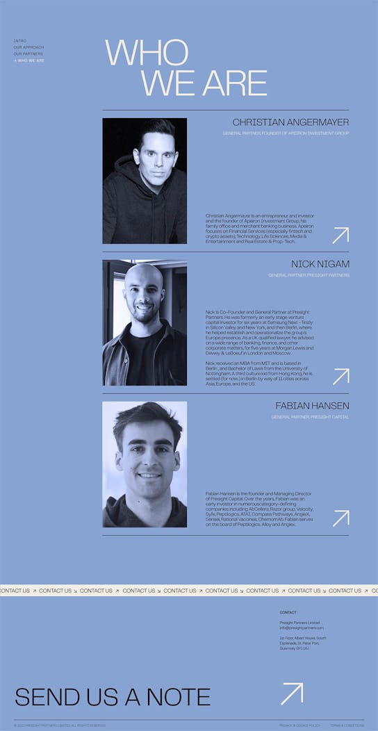 Presight Partners is a new fund of venture funds started in 2021 by Christian Angermayer’s Apeiron Investment Group and Nick Nigam. Within the category of Fund-Of-Funds, Presight Partners aims to be a fresh alternative, attracting younger, emerging fund managers. monopo helped Presight Partners to build their launch website and visual identity to set the company apart within the risk-averse fund-of-funds category.
