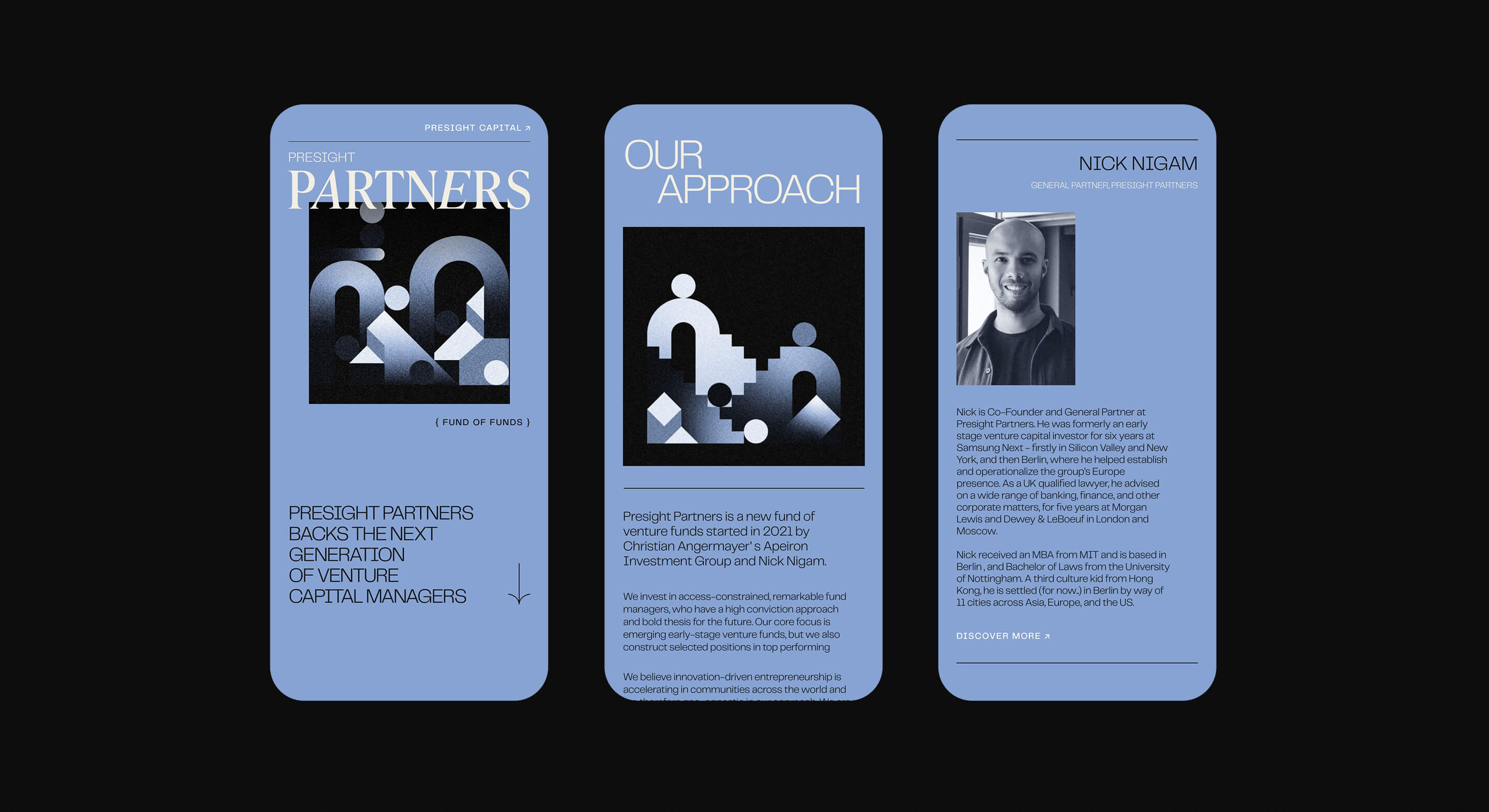 Presight Partners is a new fund of venture funds started in 2021 by Christian Angermayer’s Apeiron Investment Group and Nick Nigam. Within the category of Fund-Of-Funds, Presight Partners aims to be a fresh alternative, attracting younger, emerging fund managers. monopo helped Presight Partners to build their launch website and visual identity to set the company apart within the risk-averse fund-of-funds category.
